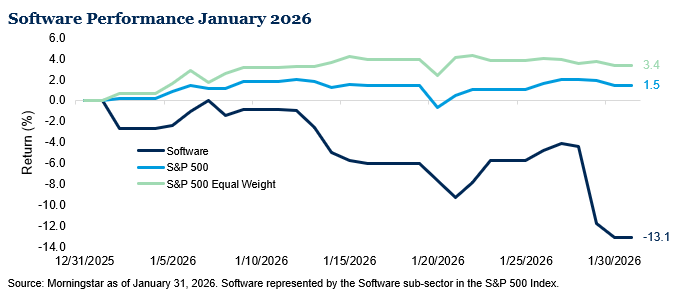 January brought mixed impact from AI during the month. We discussed the potential for disruption and displacement from AI as part of our “AI Playbook” theme in our 2026 Outlook. Investor concerns took hold about the potential disruption generative AI would have on software companies during the month following a new tool for Anthropic’s Claude large language model that can help with tasks for legal, marketing and data analysis. Shares of Oracle and Salesforce fell over 15% and 19%, respectively, for the month and resulted in the software sector being down 13.1%, wiping out nearly $800 billion in market value.1 On the other hand, semiconductor companies, particularly abroad, continue to benefit from the demand for chips and flash memory. Emerging markets were a standout in the month. Among the top contributors were Taiwan Semiconductor, up 14.3% in January, and SK Hynix, up almost 40%. We highlighted in our Outlook that having thoughtful diversification to areas of the market such as non-U.S. equity and small and mid-cap U.S. stocks may help balance portfolios and capture the benefits from a broadening of AI, and we are seeing this take shape so far in 2026.