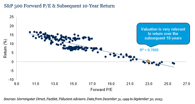 Today, markets are expensive by nearly every measure. What does that mean for 2026? As evidenced above, not much. But for long-term investors, it matters a great deal. High valuations call for deliberate risk management, thoughtful diversification, and a clear plan for what to do if prices fall.
