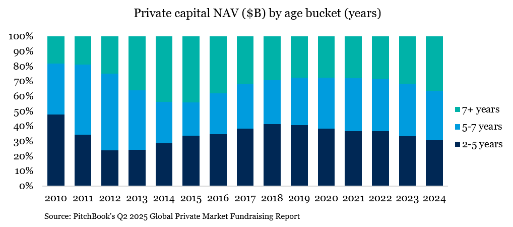 Public markets remain near record highs, private market return profiles are holding up, and investors continue to talk about pent-up demand. So, why does this disconnect persist? Liquidity remains the missing piece. While dry powder is still substantial, 2024 marked the first decline in dry powder since 2010, with balances falling by more than $300 billion year-over-year. Capital calls have outpaced distributions in six of the past seven years, leaving LPs cautious. To generate liquidity, GPs have leaned harder on tools like NAV loans, continuation vehicles and structured exits, which represent creative but imperfect solutions to a persistent imbalance.