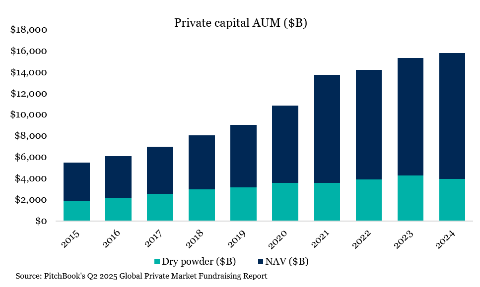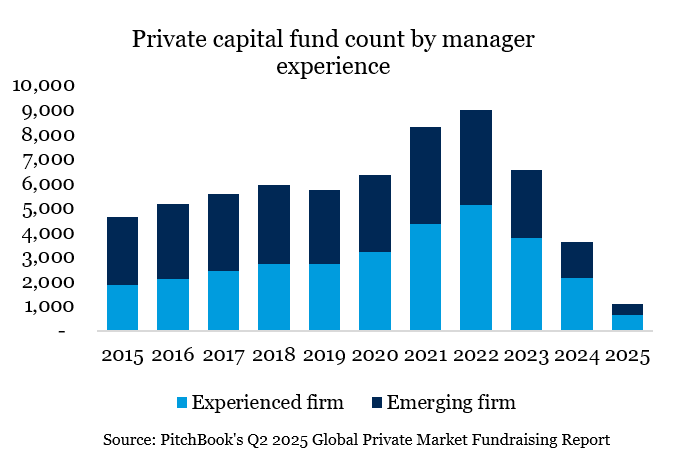 Ask anyone active in the market and they will tell you fundraising has not gotten any easier. If the anecdotes aren’t convincing, the numbers should be. Through the first half of 2025, global private capital fundraising totaled $640 billion across just over 1,100 funds, a sharp contraction from the $910 billion raised in 2023, and barely half of the $1.27 trillion closed in 20211. Fund count has been hit even harder, falling nearly 50% YoY with fewer than 3,000 funds globally holding a final close over the past four quarters, compared to almost 9,000 at the cycle peak.