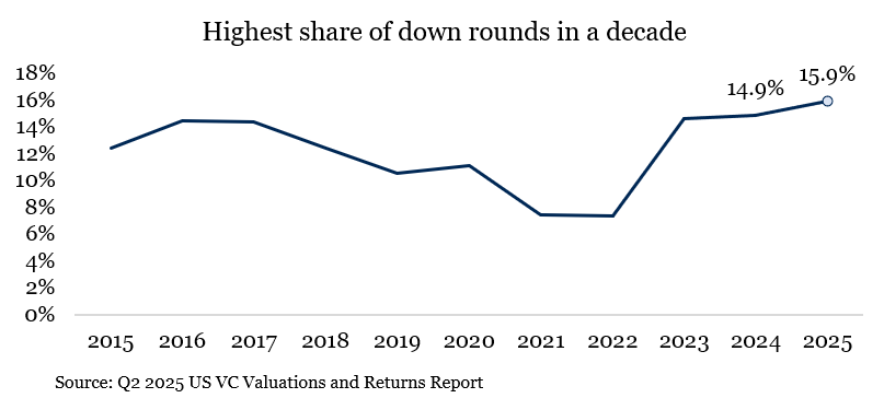 While AI-centric start-up companies have propelled deal activity, the broader market tells a different story. Many mature, venture-backed businesses have faced valuation pressure, with 2025 marking the highest share of down rounds in a decade. Nearly every major listing in Q2 priced below prior private valuations, underscoring some of the challenges for late-stage companies navigating today’s environment. In many ways, however, the reset has created more capital efficient and resilient startups as they have recently seen how capital supply can evaporate.