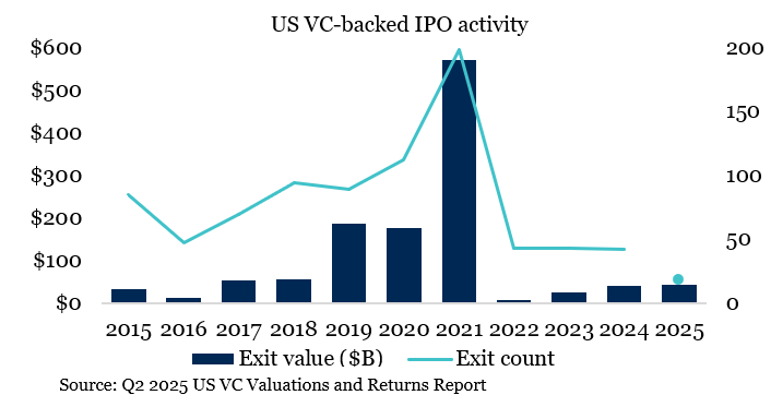 While the narrative going into 2025 was increased optimism around the IPO market, just 18 companies have completed a listing, pacing the year for the lowest in a decade. So far, the year can be described as quality over quantity for VC backed IPOs. While the volume of deals fell short of optimistic forecasts, the aftermarket performance of those that did list has been exceptional, signaling strong investor appetite for high-growth, innovation-driven companies. The market is cautiously optimistic heading into 2026, but the IPO window remains selective, favoring companies with clear paths to profitability and exposure to AI or digital infrastructure.