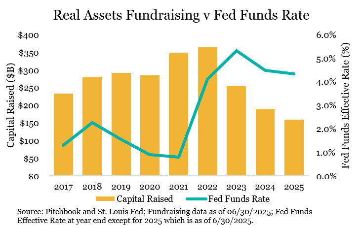 Although elevated interest rates since 2022 have broadly slowed fundraising, early signs of recovery are emerging in 2025, particularly within Real Assets (excluding real estate) and to a lesser extent within more traditional Real Estate. In Real Assets, capital raised in the first half of 2025 nearly matches the total raised in all of 2024, while Real Estate has already secured 68% of its 2024 total. This rebound is likely supported by expectations of lower future interest rates and asset owners gradually accepting recent asset repricing.